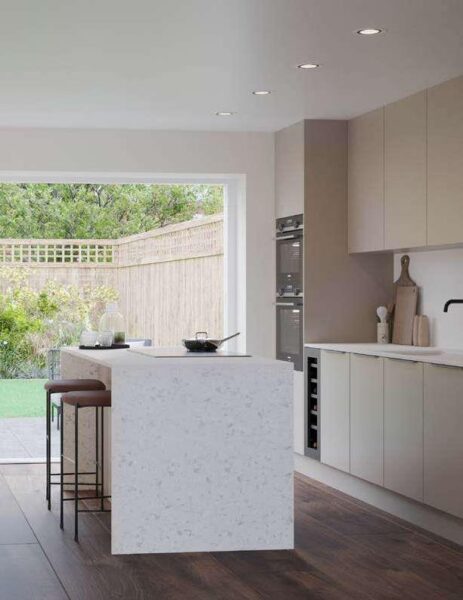 The contemporary kitchen is equipped with matte flat panel units, integrated Siemens and Electrolux appliances, and DuPont Montelli work surfaces. Whether you’re preparing a quick meal or hosting friends, this kitchen meets all your cooking needs!
